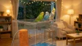 アクリ屋のバードケージケースを使用している様子。透明度が高くインコが見やすく、扉が天井にスライド収納されている状態を示す画像。