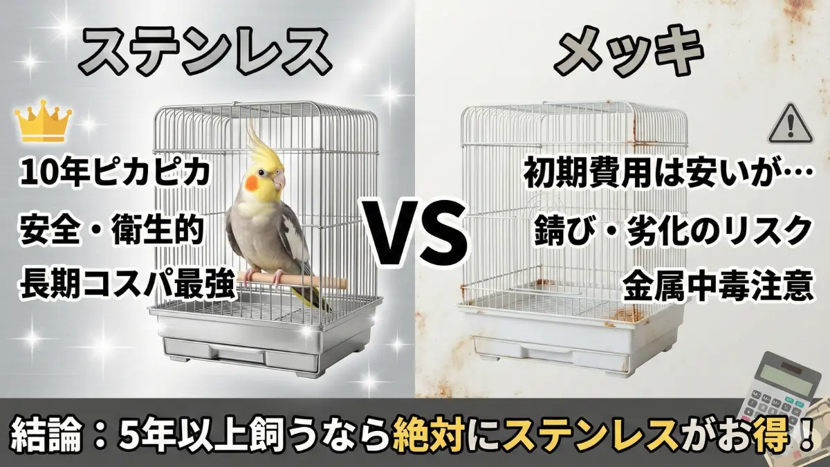 ステンレス版は耐久性に優れ、適切な手入れで長期使用が期待できます。銀メッキ版も適切な手入れで5年以上使用可能。オカメインコの寿命を考えると、高品質なケージへの投資は決して高くありません。
