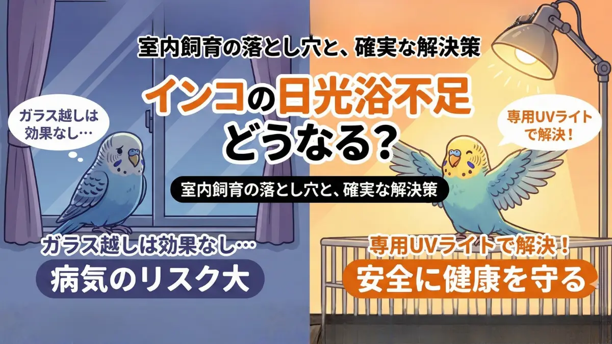 インコにとっての日光浴は、カルシウムを吸収し、丈夫な骨と卵を作るための「命綱」です。日光浴不足は、低カルシウム血症や卵詰まりといった深刻な病気を招くだけでなく、毛引きなどの精神的なストレスの原因にもなります。