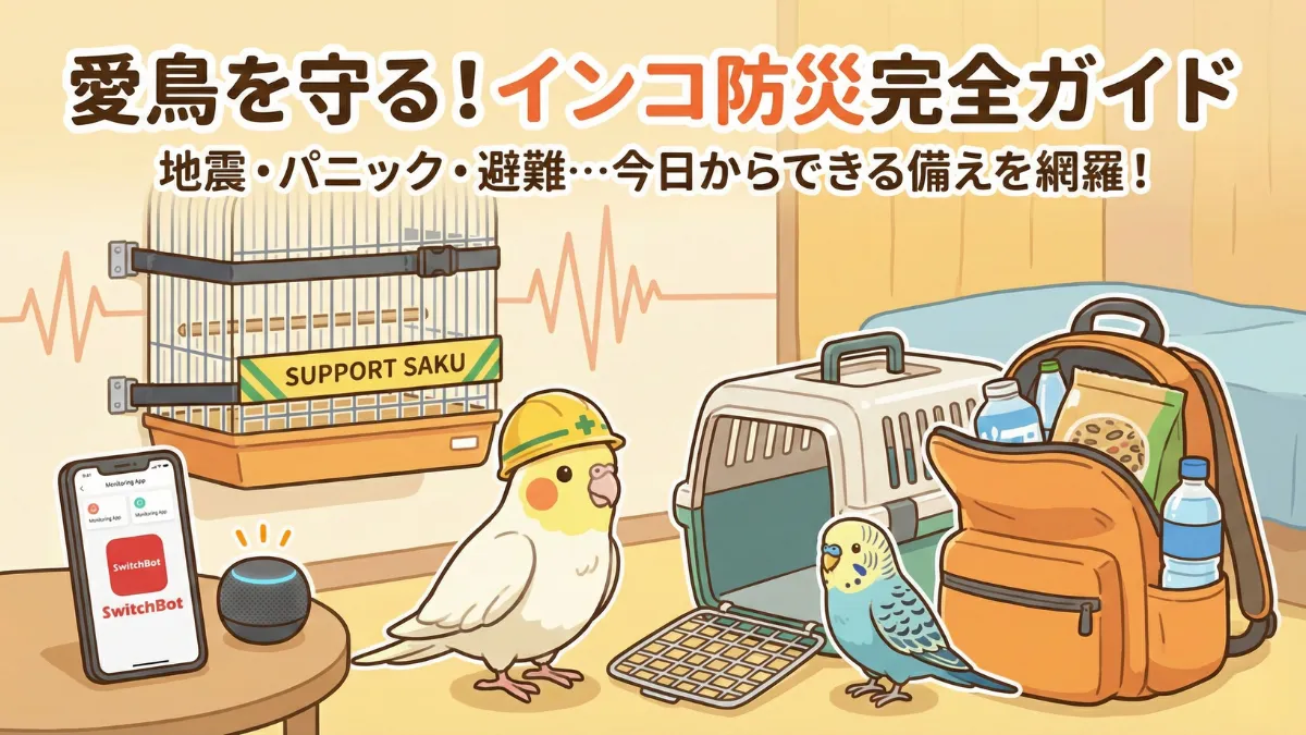 最新のIoT技術(SwitchBot)を使えば、留守中や就寝中のリスクを大幅に減らすことができます。また、避難用のキャリーや備蓄品を揃えておくことで、いざという時に慌てずに行動できます。物理的な対策とデジタルな見守りを組み合わせ、愛鳥との安全な暮らしを守りましょう。