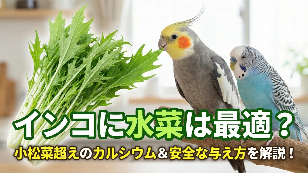 普段より頻度を増やし、ゆで卵の白身などのタンパク源と一緒に水菜を与えることで、スムーズな換羽と美しい羽色の形成を促します。換羽期の詳しい対応は、セキセイインコの換羽期完全ガイドやオカメインコの換羽期マニュアルをご覧ください。