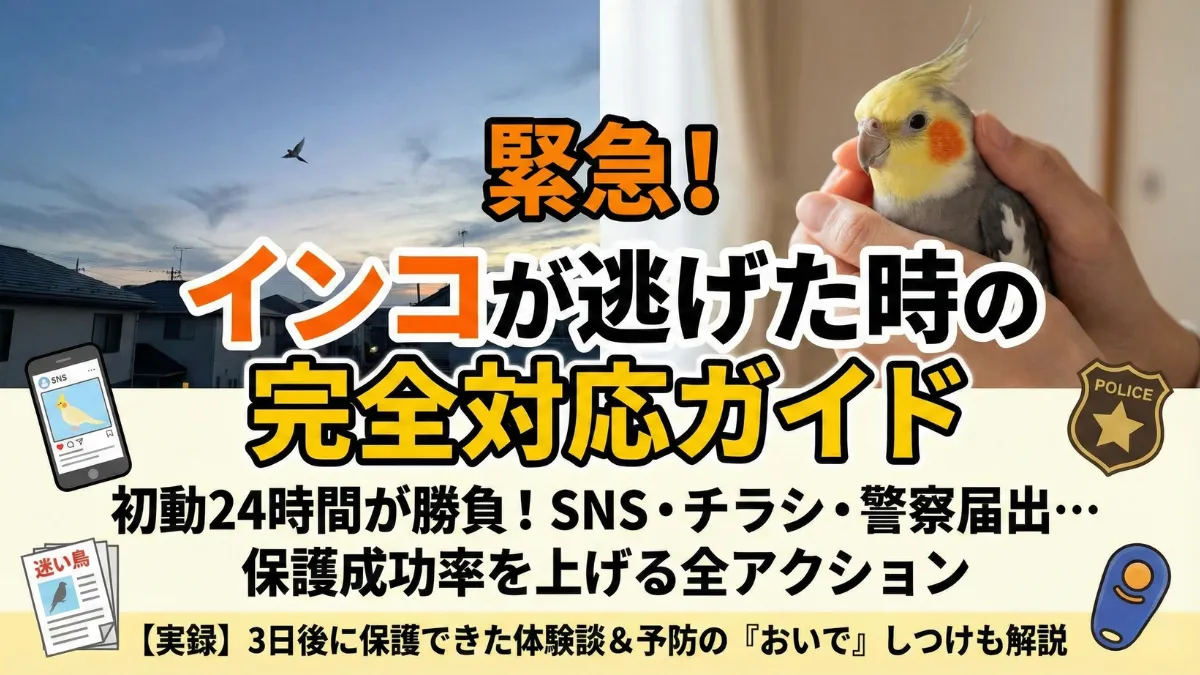 警察への遺失物届出で公的な探索ルートを確保し、同居インコの鳴き声を再生して呼び寄せる効果も期待できます。ただし、パニック状態のインコは捕獲が困難で、「おいで」のしつけがあれば保護の可能性が向上します。