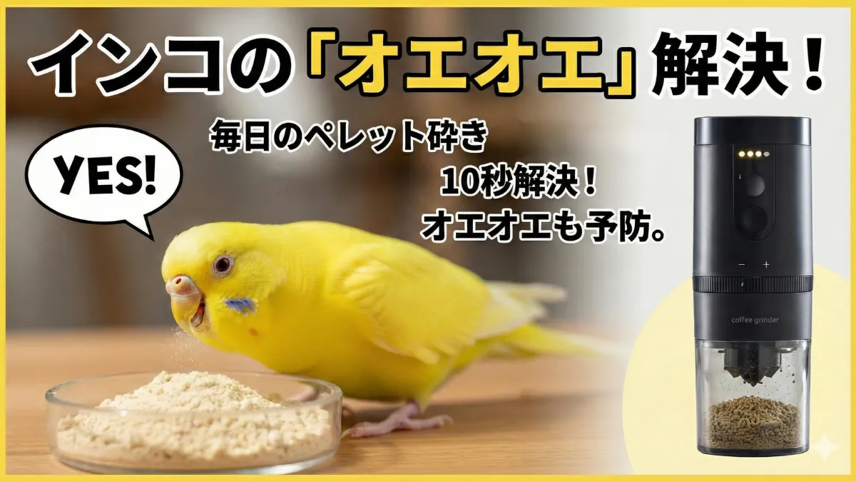 セキセイインコのオエオエは、ペレットを「砕く」だけで解決できることがほとんどです。しかし、毎日の手作業は飼い主さんにとって大きな負担になります。