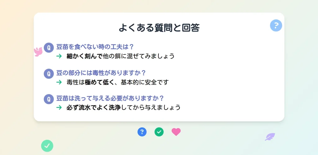 インコに豆苗を与えたいけれど、「本当に安全なの?」「どのくらいの量をどのくらいの頻度で与えれば良いの?」「豆の部分も一緒に食べてしまって大丈夫?」といった不安をお持ちの飼い主さんは多いのではないでしょうか。