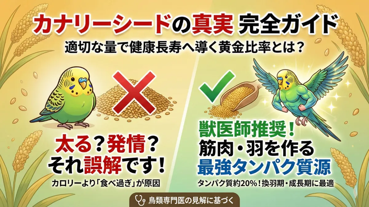 カナリーシードは太る餌や発情する餌と誤解されがちですが、実際にはタンパク質含有量20.3%を誇る、鳥の体作りになくてはならない優秀な食材です。太る原因は食材そのものではなく、美味しすぎるがゆえの食べ過ぎや狙い食いにあります。