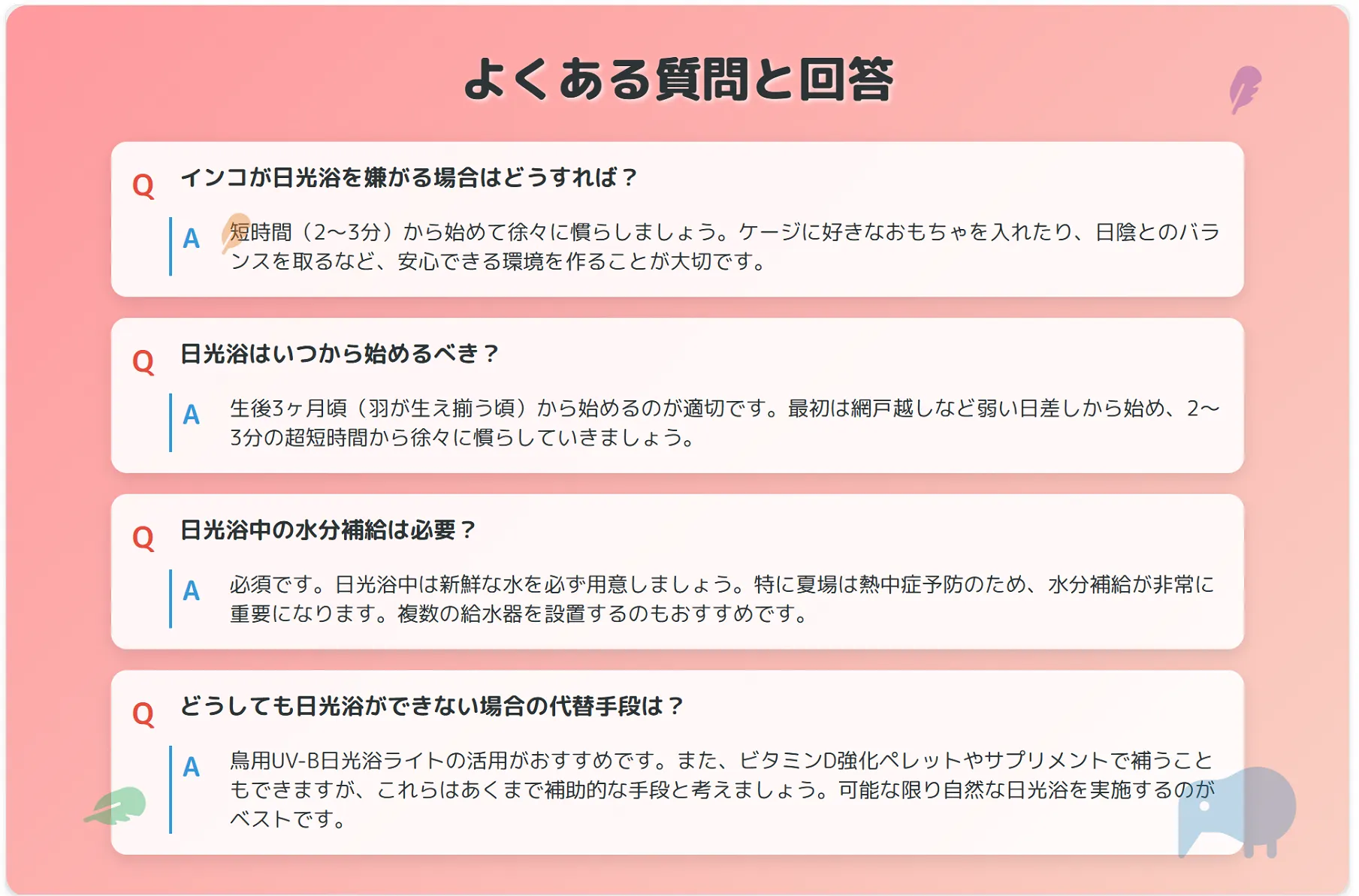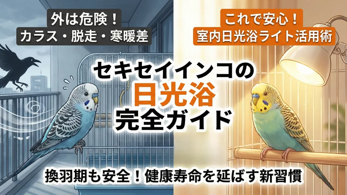 セキセイインコにとって日光浴は、骨を丈夫にし、精神を安定させるために欠かせない習慣です。特にデリケートな換羽期は、体力消耗に気をつけながら適度に行うことで、新しい羽作りをサポートできます。