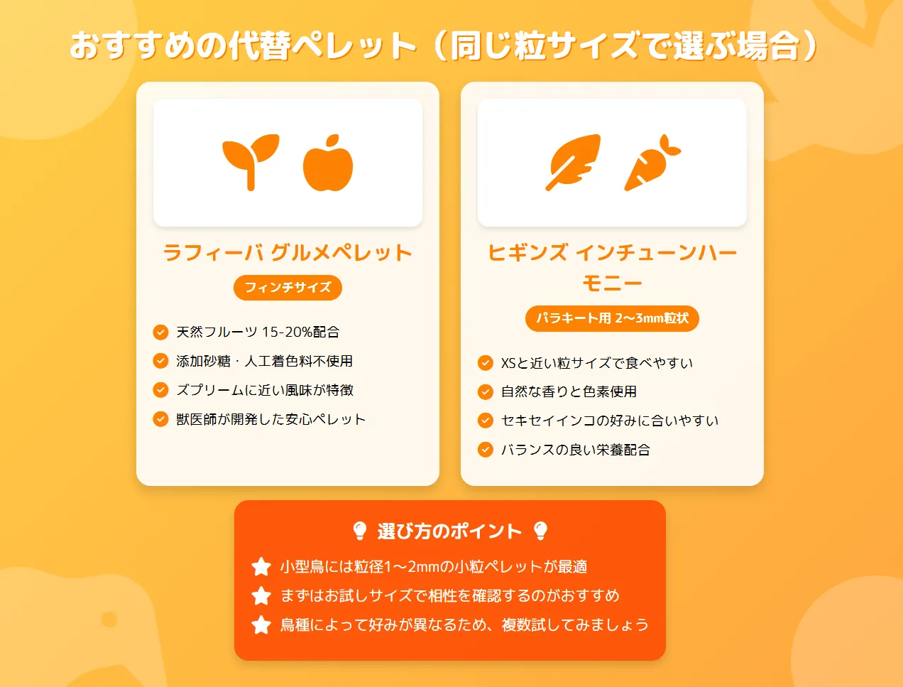 「フルーツブレンドしか食べない」問題でお困りの方は、こちらの記事でフルーツブレンドから他のペレットへの移行術を詳しく解説しています。併せてご覧ください。
